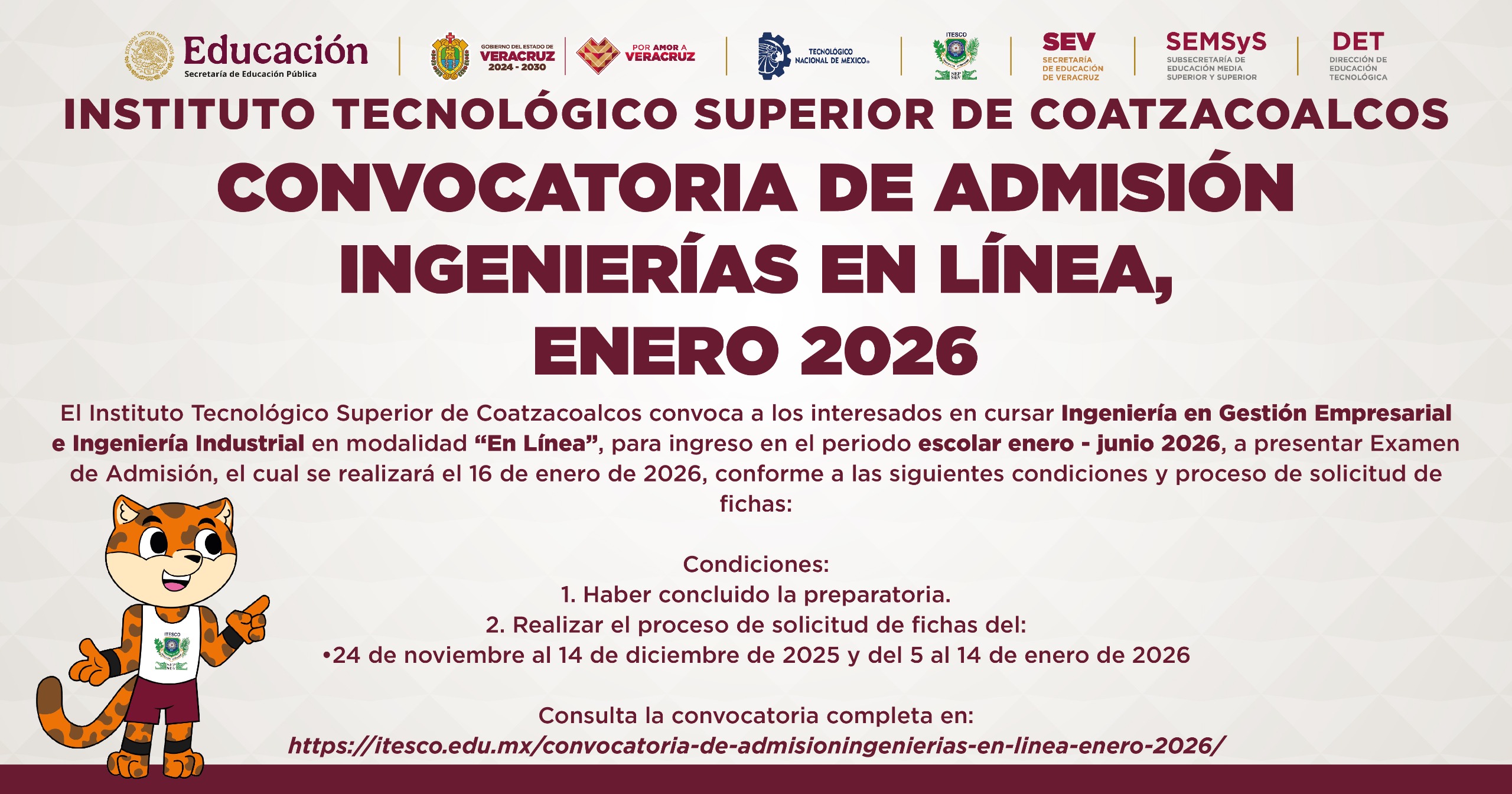 El Instituto Tecnológico Superior de Coatzacoalcos convoca a los interesados en cursar Ingeniería en Gestión Empresarial e Ingeniería Industrial en modalidad “En Línea”, para ingreso en el periodo...